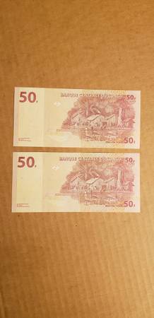 these notes are from congo. made in 2013. 2--50 francs. condition is uncirculated. cash only. meet in public place.