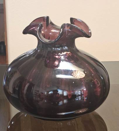 This is a purplish Vase and beautiful shape. 7" tall. One of the kind by Van Briggle. It is old and expensive item. Check it out.
