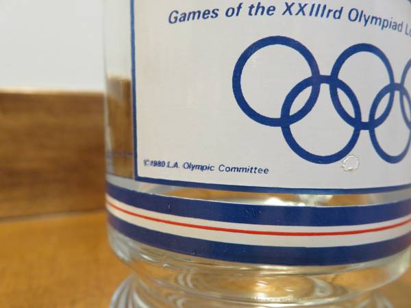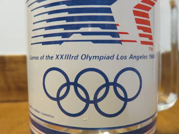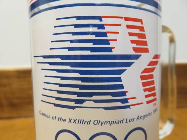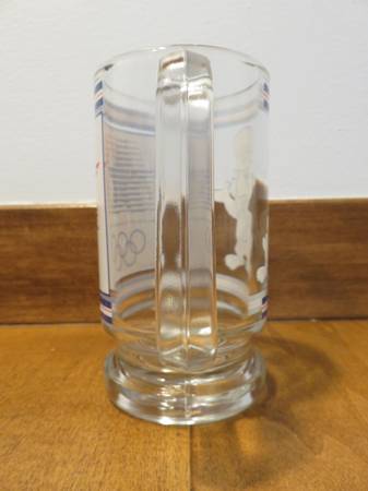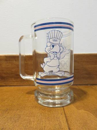 Description: For sale is one glass mug for the 1984 summer Olympics in Los Angeles, California. This mug features the official logo on one side and the mascot Sam the Eagle on the other side. The logo has blue, white, and red stars and below is text reading “Games of the XXIIIrd Olympiad Los Angeles 1984”. There are also blue, white, and red stripes above and below the logo and mascot. This glass measures about 5.5 inches high and 3 inches diameter (not including the handle). Total width of the glass (including the handle) is about 4.25 inches.