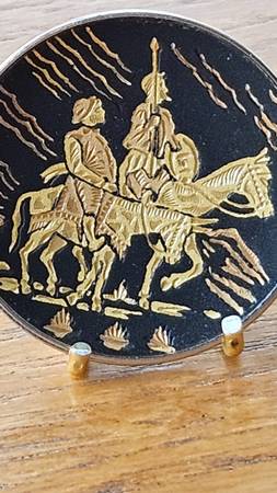 * The plate with Don Quixote and Sancho Panza (Cervantes) is from Toledo, Spain and it is carved in gold and silver. Measures 1.5" diameter
