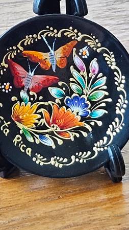 * The plate from Costa Rica is has colorful with designs of butterflies and flowers, and it has GOLD around the designs. Measures 1.7" diameter