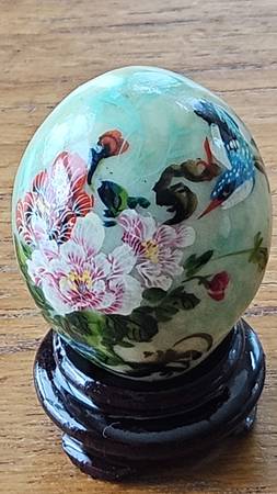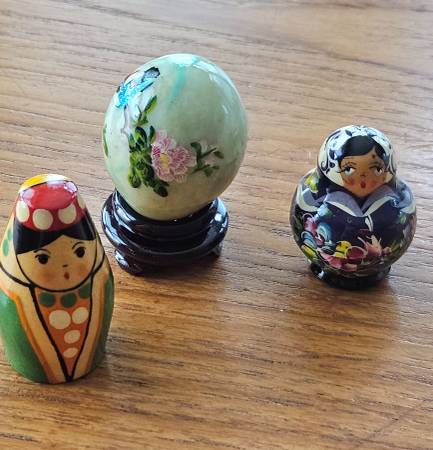 * The glass EGG is painted by hand and it has a perfect stand for it. From Japan * The Turkish girl is from Turkey * The gorgeous girl, I think is from Peru, but not sure in my notes. 3 items for $20