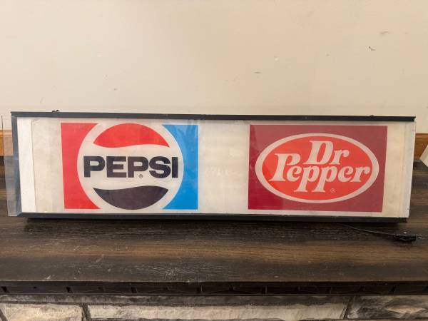 Vintage Pepsi / Dr. Pepper Neon Light Up Sign in great working condition. You can remove the Pepsi / Dr. Pepper and put your own logo or a different sign in it. It has 4 rings around each corner for hanging as well. Measurements: