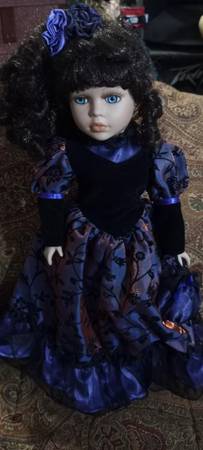 $ 100 Vintage porcelain Doll. Beautiful Doll in perfect condition. Black and Purple Dress brown hair comes with stand