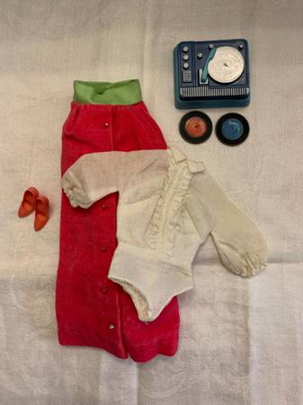 1965 Mattel Barbie "Disc Date" Fashion # 1633, Mint/Complete and including sheer white organdy lined body blouse with collar and 3/4 sleeves, fuchsia velvet evening skirt with six matching buttons ("diamond" insets), chartreuse waistband and fuchsia closed-toe shoes, a blue record player, 2 records with blue and red Barbie labels. Cash Sale Only. US$ 130.00
