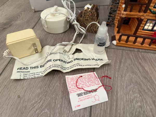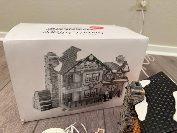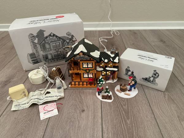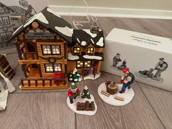 Department 56 SNOW VILLAGE Smokey Mountain Retreat and Chopping Firewood. It is in great condition! The smoking chimney works! Comes from a smoke-free environment. Asking $50 for both pieces.