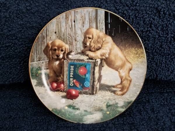 "Double Take" (#1780 I) by Jim Lamb. Two Cocker Spaniels and an apple crate. First issue in the Puppy Playtime Collection. Created exclusively by River Shore 1987. No box.