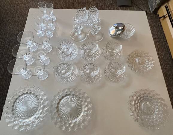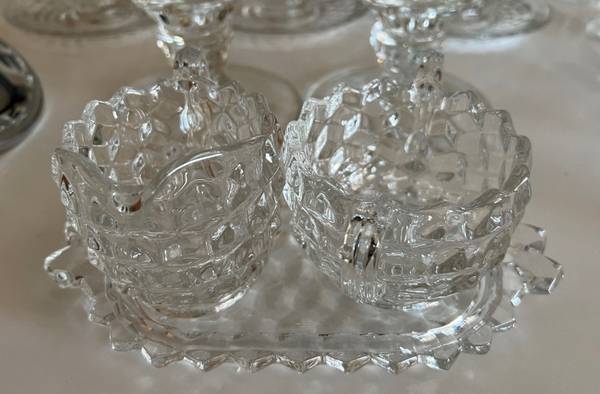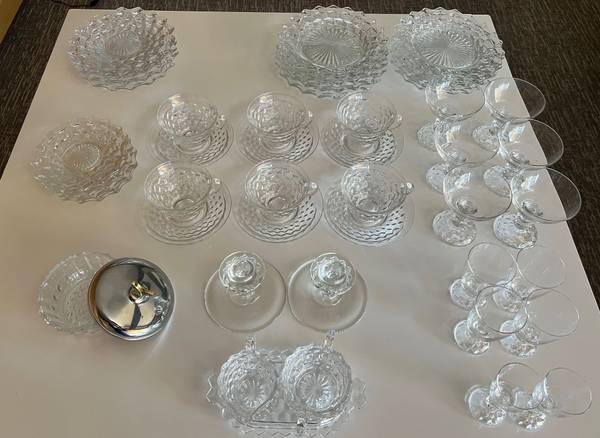 This vintage pressed/patterned clear glass collection, manufactured by the Fostoria Glass Company, features a cube design with a scalloped edge on some dishes and a star pattern in the middle. The glass is perfectly clear due to hand fire polishing with smooth seams. Asking $200 for collection or best offer.