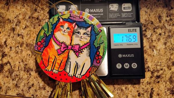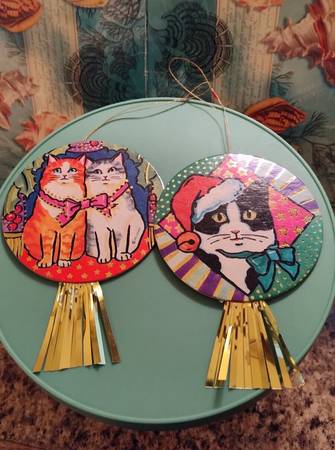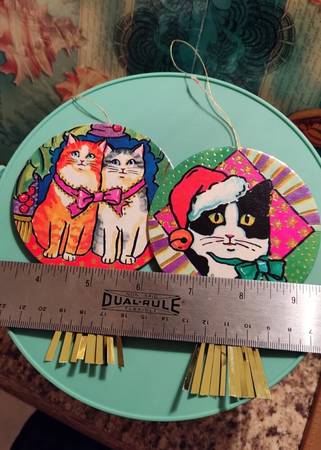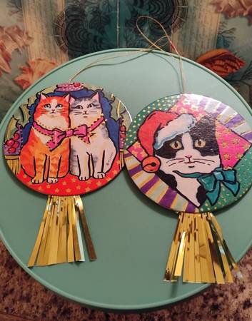 Set of 2 Vintage Whimsical Colorful Cats Christmas Ornaments - 3 1/2 in.+Tinsel - $20 set of 2