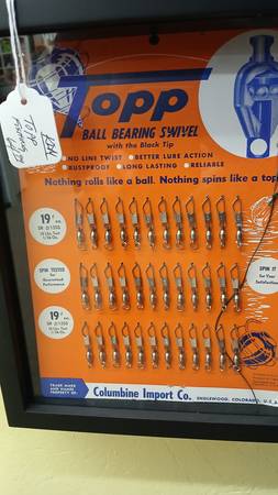 Shelby razor blade counter top display, Fins and Deuces punch board, Topp ball bearing fishing swivels from Englewood Colorado, Debonair snake key chain, gold plated key holder, Black Wax theatrical makeup. All in booth KDM at the Colorado Antique Gallery 5501 south Broadway Littleton 80121. As you can see nicely framed in shadow boxes. Most from the 1940s and 1950s. See my other items under Neon, or neon sign or neon clock harley davidson, lexus stewart warner, tivoli Pizza Hut neon clock, Harley Davidson neon clock Budweiser neon bottle. Great man cave items . Valentines day