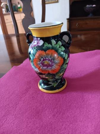 This is a beautiful 1950's 2 handle, hand painted Japanese vase. It was produced by the Gold Castle Porcelain Company. 5" high. Opening is 2" wide. Excellent condition.