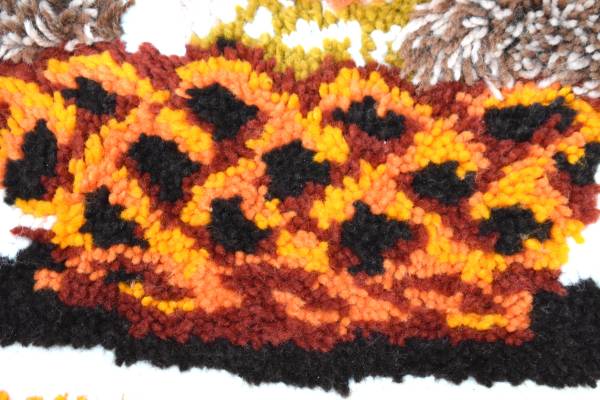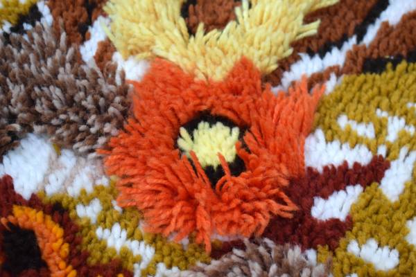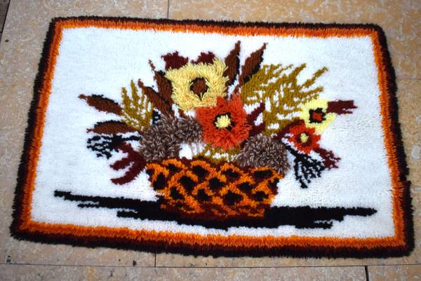 This cool vintage hook rug could be used as a wall hanging or rug, two of the flowers have long "petals" giving it a three dimensional look. It measures 38" by 25 1/2". Cash only please