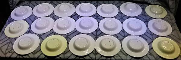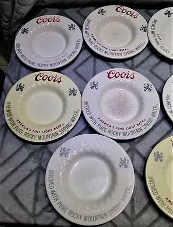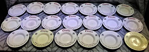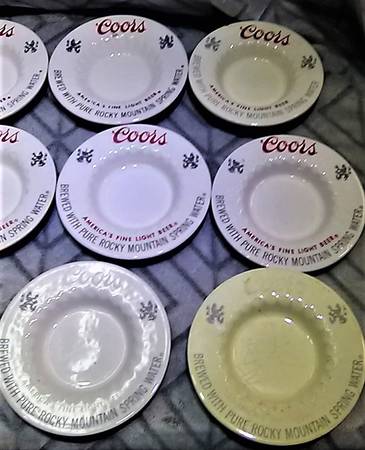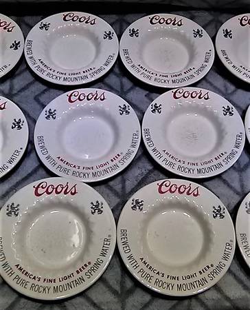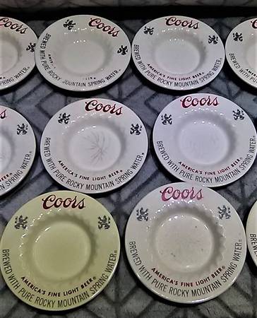20 Vintage Used Coors Ceramic Ash Trays With Imperfections. All are still usable condition, but most have been very well used over many years. Some have chips, darker coloring , missing paint and fine cracks at times .