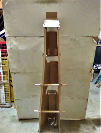 Wood pegs have been added to help keep the cardboard stand in line as the original cardboard has been torn some over time.