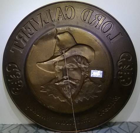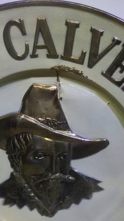 Vintage large 22 3/4" diameter solid brass sign, featuring the distinguished Lord Calvert Blended Whiskey logo. Perfect for collectors and enthusiasts alike, this advertising sign captures the essence of a bygone era and makes a striking display piece in any setting. Its robust metal construction ensures durability, while the intricate design showcases the craftsmanship of the period.