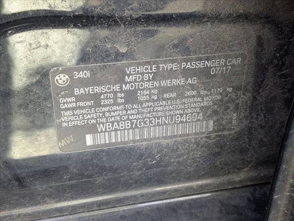* Venetian Beige/Black; Dakota Leather Upholstery * Black Sapphire Metallic * Sun/Moonroof * Leather Seats * Keyless StartThis vehicle includes a Money-Back Guarantee* and passed our precise inspection process. Best of all the price you see is the price you pay. No haggling. No back and forth. No pressure. And this price is so good it is guaranteed. *Money-Back Guarantee is valid for 5 days or 250 miles, whichever comes first. Subject to certain terms and conditions. See store for details. Some restrictions apply.Thank you for your interest in one of AutoNation Chrysler Jeep West's online offerings. Please continue for more information regarding this 2017 BMW 3 Series 340i xDrive with 73,490mi. You appreciate the finer things in life, the vehicle you drive should not be the exception. Style, performance, sophistication is in a class of its own with this stunning BMW 3 Series 340i xDrive. You could spend more on fuel each month than on your vehicle payments, so why not consider one with exceptional fuel economy like this 2017 BMW 3 Series. Hit the gas pedal and put the engine power to all four wheels. With AWD, you'll have the greater performance right off the line, every time you drive. The 3 Series 340i xDrive is well maintained and has just 73,490mi. This low amount of miles makes this vehicle incomparable to the competition. Beautiful exterior. Clean interior. This BMW 3 Series is so immaculate it is practically new. Added comfort with contemporary style is the leather interior to heighten the quality and craftsmanship for the BMW 3 Series 340i xDrive. More information about the 2017 BMW 3 Series: The BMW 3 Series is a family of sporty sedans and wagons sized at what would be considered a compact car in the U.S. The 2017 BMW 3 Series sedans, Sports Wagon, and Gran Turismo models are built on a platform that made its debut with the 2012 model. Across its entire lineup, the 3 Series models stand out for being athletic, responsive and fun to drive, as well as more fuel-efficient than most other alternatives. The F30 redesign brought more back-seat space and cargo space to sedans, as well as a more sophisticated and isolated ride. M3 models, meanwhile, continue to be one of the most practical high-performance cars on the market. This model sets itself apart with high-tech options, practicality and comfort, athletic driving feel, compact size and maneuverability, long list of appearance packages and trims, fuel efficiency, and A variety of options