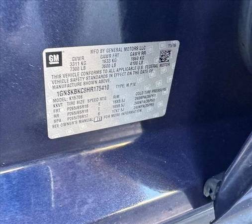 The following items have been reconditioned on this vehicle: new brakes and new battery! * Luxury Package * Seats; Second Row Bucket; Power Release * Leather Seats * 3rd Row Seat * Lane Keeping Assist * Keyless Start * Audio System; Chevrolet Mylink Radio With 8" Diagonal Color Touch-Screen * Blue Velvet Metallic * Driver Information Center; 4.2" Diagonal Multi-Color * Emissions; Federal Requirements * Engine; 5.3L Ecotec3 V8 With Active Fuel Management; Direct Injection And Variable Valve Timing * Fog Lamps * Front And Rear Parking Assist * Jet Black/Dark Ash; Leather-Appointed Seat Trim * Keyless Start; Push Button * License Plate Front Mounting Package * Liftgate; Power; Hands Free * Lt Preferred Equipment Group * Mirrors; Outside Heated Power-Adjustable; Power-Folding And Driver-Side Auto-Dimming * Paint Scheme; Solid Application * Passive Entry System * Rear Axle; 3.08 Ratio * Rear Cross-Traffic Alert; Sensor Indicator * Seating; Front Bucket With Leather-Appointed Seating * Seats; Heated Second Row Outboard Seats * Seats; Third Row 60/40 Split-Bench; Power Fold * Side Blind Zone Alert With Lane Change Alert * Steering Column; Power Tilt And Telescopic * Steering Wheel; Heated; Leather-Wrapped And Color-Keyed * Suspension Package; Premium Smooth Ride * Tires; P265/65R18 All-Season; Blackwall * Transmission; 6-Speed Automatic; Electronically Controlled * Wheels; 18" X 8.5" (45.7 Cm X 21.6 Cm) Aluminum With High-Polished Finish * Wireless ChargingThis vehicle includes a Money-Back Guarantee* and passed our precise inspection process. Best of all the price you see is the price you pay. No haggling. No back and forth. No pressure. And this price is so good it is guaranteed. *Money-Back Guarantee is valid for 5 days or 250 miles, whichever comes first. Subject to certain terms and conditions. See store for details. Some restrictions apply.