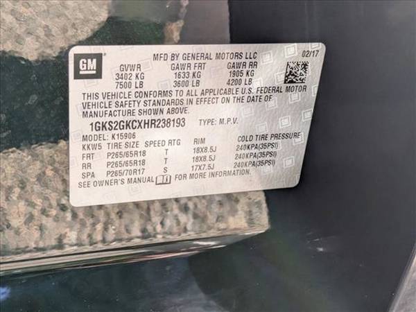 * Leather Seats * Audio System; 8" Diagonal Color Touch Screen Navigation With Intellilink * Navigation System * 3rd Row Seat * Lane Keeping Assist * Keyless Start * Cooled Front Seat(S) * Driver Information Center; 4.2" Diagonal Multi-Color * Emissions; Federal Requirements * Engine; 5.3L Ecotec3 V8 * Jet Black; Perforated Leather-Appointed Seat Trim * License Plate Front Mounting Package * Onyx Black * Rear Axle; 3.08 Ratio * Seats; Front Bucket With Perforated Leather-Appointed * Seats; Second 60/40 Split-Folding Bench * Slt Preferred Equipment Group * Solid Paint * Suspension Package; Premium Smooth Ride * Tires; P265/65R18 All-Season; Blackwall * Transmission; 6-Speed Automatic; Electronically Controlled * Wheels; 18" X 8.5" (45.7 Cm X 21.6 Cm) Bright Machined AluminumThis vehicle includes a Money-Back Guarantee* and passed our precise inspection process. Best of all the price you see is the price you pay. No haggling. No back and forth. No pressure. And this price is so good it is guaranteed. *Money-Back Guarantee is valid for 5 days or 250 miles, whichever comes first. Subject to certain terms and conditions. See store for details. Some restrictions apply.2017 GMC YUKON XL SLT 4X4 Accident Avoidance Systems Adjustable Lumbar Support Adjustable Pedals Air Suspension Android Auto Anti-Theft System Apple Carplay Approach Lights Auto-dimming Rearview Mirror Automatic Climate Control Black Roof Rails Blind Spot Warning Bluetooth Braking Assist Bucket Seats Check Rear Seat Reminder Chrome Wheels Connected Car Connected Car Integrated Apps Cooled Seats Cruise Control Curtain Airbags Dual-Zone Climate Control Electronic 4WD Selector Electronic Braking System Electronic Messaging Assistance Electronic Traction Control Enhanced Driver Alert Package Fog Lights Front Bucket Seats Full Size Spare Tire Halogen Headlights Heated Seats Heated Side Mirrors Heated Steering Wheel Keyless Entry Leather Steering Wheel Leather Trimmed Seats Locking Differential Memorized Seat Settings Memory Package Multi-Function Display On Demand 4WD Parking Sensors Power Adjustable Pedals Power Liftgate Power Seats Power Telescoping Steering Wheel Premium Sound System Push-Button Start Radio Data System Rear Air Conditioning Rear Climate Controls Rear Cross Traffic Alert Rear Headrests Rear Power Seats Rearview Camera Remote Engine Start Running Boards Satellite Radio Side Airbags Smooth Ride Suspension Package Split Folding Third Row Seat(s) Stability Control Stainless Steel Exhaust Tip Steering Wheel Mounted Controls Third Row Seating Tire Pressure Monitoring System Tow/Haul Mode Trailer Hitch Trailer Wiring Turn Signal Mirrors USB Audio Input Voice Activated Commands Wi-Fi Compatible Wireless Charging Station