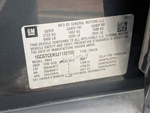* License Plate Kit; Front * Audio System; Chevrolet Mylink Radio With 8" Diagonal Color Touch-Screen; AM/FM Stereo * Emissions; Federal Requirements * Engine; 3.6L Di Dohc V6 Vvt * Graphite Metallic * Gvwr; 6000 Lbs. (2722 Kg) * Jet Black; Cloth Seat Trim * Lt Preferred Equipment Group * Rear Axle; 3.42 Ratio * Seats; Front Bucket * Solid Paint * Tire; Spare 265/70R16 All-Season; Blackwall * Tires; 255/65R17 All-Season; Blackwall * Tow/Haul Mode * Transmission; 8-Speed Automatic * Wheels; 17" X 8" (43.2 Cm X 20.3 Cm) Blade Silver Metallic Cast AluminumLooking for a clean, well-cared for 2018 Chevrolet Colorado? This is it. This Chevrolet includes: ENGINE, 3.6L DI DOHC V6 VVT V6 Cylinder Engine Gasoline Fuel *Note - For third party subscriptions or services, please contact the dealer for more information.* This 4WD-equipped vehicle will handle majestically on any terrain and in any weather condition your may find yourself in. The benefits of driving an Four Wheel Drive vehicle, such as this ChevroletColorado 4WD LT, include superior acceleration, improved steering, and increased traction and stability. You can tell this 2018 Chevrolet Colorado has been pampered by the fact that it has less than 76,990mi and appears with a showroom shine. This vehicle won't last long, take it home today.