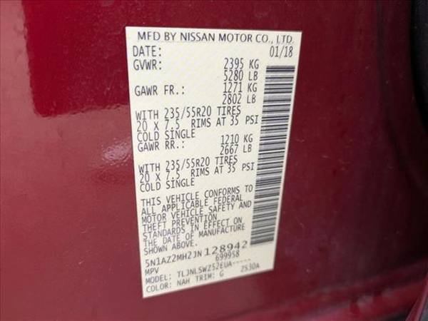 * Panoramic Roof * Leather Seats * Navigation System * [L92] Carpeted Floor Mats & Carpeted Cargo Mat * [B92] Splash Guards * Keyless Start * Rear Spoiler * Cooled Front Seat(S) * [C03] 50 State Emissions * Cayenne Red Metallic * Graphite; Leather Appointed Seat TrimThis vehicle includes a Money-Back Guarantee* and passed our precise inspection process. Best of all the price you see is the price you pay. No haggling. No back and forth. No pressure. And this price is so good it is guaranteed. *Money-Back Guarantee is valid for 5 days or 250 miles, whichever comes first. Subject to certain terms and conditions. See store for details. Some restrictions apply.Thank you for your interest in one of Autonation Subaru West's online offerings. Please continue for more information regarding this 2018 Nissan Murano Platinum with 93,979mi. This well-maintained Nissan Murano Platinum comes complete with a CARFAX one-owner history report. Off-road or on the street, this Nissan Murano Platinum handles with ease. With amenities and luxuries befitting a modern day king, this splendorous coach reigns supreme. Simply put, this all wheel drive vehicle is engineered with higher standards. Enjoy improved steering, superior acceleration, and increased stability and safety while driving this AWD NissanMurano Platinum. The Murano Platinum has been lightly driven and there is little to no wear and tear on this vehicle. The care taken on this pre-owned vehicle is reflective of the 93,979mi put on this Nissan.