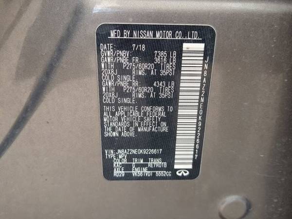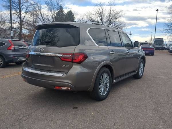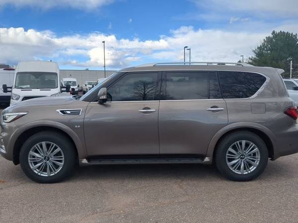 * [F01] Proassist Package * Sun/Moonroof * Leather Seats * Navigation System * 3rd Row Seat * Lane Keeping Assist * Keyless Start * Rear Spoiler * [C03] 50 State Emissions * Graphite; Leather-Appointed * Smoky QuartzAUTONATION FORD ARAPAHOE PRESENTS THIS 2019 INFINITI QX80 LUXE Excellent Condition 110,447 Miles Address: 10039 E Arapahoe Rd, Centennial, CO 80112 PHONE: 844-768-8263 Step into luxury and power with this 2019 INFINITI QX80 LUXE , a full-size SUV that delivers premium comfort, bold style, and impressive performance. With only 110,447 miles , this QX80 has been well cared for and is in great shape inside and out . Finished in a sleek, commanding design, the QX80 LUXE offers a refined leather interior , heated front seats , and three-row seating that comfortably accommodates up to seven passengers. The cabin is crafted with high-quality materials and loaded with features like navigation, a touchscreen infotainment system, Bluetooth connectivity, premium Bose audio, tri-zone climate control, and a power sunroof . Powered by a 5.6L V8 engine paired with a smooth 7-speed automatic transmission , the QX80 delivers strong performance, confident towing capability, and a quiet, composed ride. Advanced safety features include Intelligent Cruise Control, Blind Spot Warning, Backup Camera, Parking Sensors, and Forward Emergency Braking , giving you peace of mind on every journey. If youre looking for a luxury SUV that blends elegance, comfort, and power , this INFINITI QX80 LUXE is the one. Key Highlights: 110,447 miles Excellent overall condition 5.6L V8 engine / 7-speed automatic Leather interior, heated seats, sunroof Navigation, Bluetooth, Bose premium audio Advanced safety features and 3-row seating