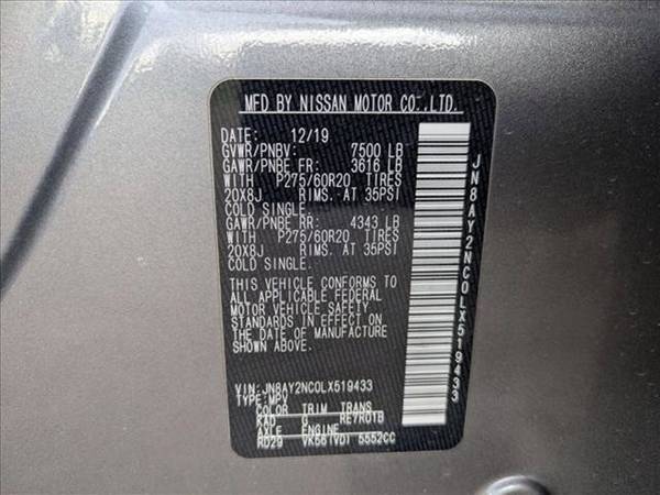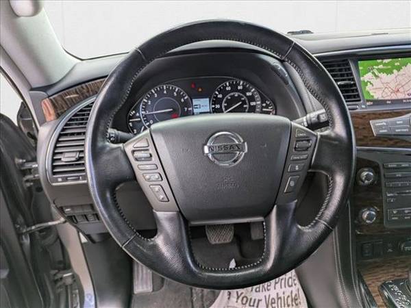 * [P01] Premium Package * Sun/Moonroof * Leather Seats * Navigation System * 3rd Row Seat * [L92] 3Rd Row Carpeted Floor Mats - Bench Seat * Keyless Start * Rear Spoiler * [C03] 50 State Emissions * Black; Leather-Appointed Seat Trim * Gun MetallicThis vehicle includes a Money-Back Guarantee* and passed our precise inspection process. Best of all the price you see is the price you pay. No haggling. No back and forth. No pressure. And this price is so good it is guaranteed. *Money-Back Guarantee is valid for 5 days or 250 miles, whichever comes first. Subject to certain terms and conditions. See store for details. Some restrictions apply.The Nissan Armada SL offers a fair amount of utility thanks to its advanced features and unique styling. It's also quite sporty, and injects an ample amount of handling chutzpah into the ridin'-high body of a family-friendly SUV. Today's luxury vehicle is not just about opulence. It's about a perfect balance of performance, comfort and attention to detail. This 2020 Nissan Armada SL is the perfect example of the modern luxury. No matter the terrain or weather, you'll drive at ease in this 4WD-equipped vehicle. With exceptional safety features and superb handling, this 4WD was engineered with excellence in mind. Marked by excellent quality and features with unmistakable refined leather interior that added value and class to the Nissan Armada SL. You can take the guesswork out of searching for your destination with this Nissan Armada SL's installed Navigation system.