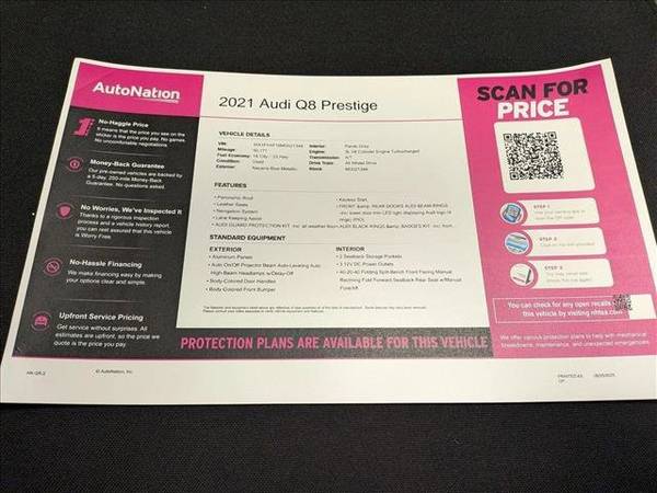 * Prestige Package * Adaptive Chassis Package * S Line Plus Package * S Line Style Package * Towing Package * Panoramic Roof * Navarra Blue Metallic * Leather Seats * Front & Rear Doors Audi Beam-Rings * Navigation System * Audi Black Rings & Badges Kit * Audi Guard Protection Kit * Lane Keeping Assist * Keyless Start * Rear Spoiler * Heads-Up Display * Cooled Front Seat(S) * Pando Gray; Leather Seating SurfacesThis vehicle includes a Money-Back Guarantee* and passed our precise inspection process. Best of all the price you see is the price you pay. No haggling. No back and forth. No pressure. And this price is so good it is guaranteed. *Money-Back Guarantee is valid for 5 days or 250 miles, whichever comes first. Subject to certain terms and conditions. See store for details. Some restrictions apply.Thank you for your interest in one of AutoNation Chrysler Jeep South Broadway's online offerings. Please continue for more information regarding this 2021 Audi Q8 Prestige with 50,171mi. This Audi includes: TOWING PACKAGE Tow Hitch ADAPTIVE CHASSIS PACKAGE All Wheel Steering Air Suspension S LINE PLUS PACKAGE Tires - Front Performance Aluminum Wheels Tires - Rear Performance AUDI BLACK RINGS PANDO GRAY, LEATHER SEATING SURFACES Leather Seats PRESTIGE PACKAGE Fog Lamps Multi-Zone A/C Heated Rear Seat(s) Transmission w/Dual Shift Mode Lane Departure Warning Mirror Memory Cooled Front Seat(s) A/C Lane Keeping Assist Heated Steering Wheel Back-Up Camera Heated Mirrors Daytime Running Lights Adaptive Cruise Control Heated Front Seat(s) Passenger Adjustable Lumbar Heads-Up Display Premium Sound System Rear A/C Power Folding Mirrors NAVARRA BLUE METALLIC FRONT & REAR DOORS AUDI BEAM-RINGS AUDI GUARD PROTECTION KIT S LINE STYLE PACKAGE Aluminum Wheels *Note - For third party subscriptions or services, please contact the dealer for more information.* Perfect for the on-the-go family, this Audi Q8 Prestige is an SUV everyone will love. With exceptional mileage, options and power, you'll insist on driving it on all your outings. Quality and prestige abound with this Audi Q8 Prestige. This vehicle has an added performance bonus: AWD. It improves handling on those winding back roads, and gives you added safety and control when driving through wet and snow weather conditions. It's not often you find just the vehicle you are looking for AND with low mileage. This is your chance to take home a pre-owned and barely driven Audi Q8. Added comfort with contemporary style is the leather interior to heighten the quality and craftsmanship for the Audi Q8 Prestige. Find the quickest driving route in this Audi Q8 Prestige using the installed navigation system. This nav system is one of the easiest to use and will help get you where you need to go quickly! If not for a few miles on the odometer you would be hard-pressed to know this 2021 Audi Q8 is a pre-owned vehicle. THANK YOU FOR VISITING AUTO NATION CHRYLSER JEEP ON BROADWAY! WE ARE YOUR ONE STOP SHOP FOR ALL YOUR VEHICLE NEEDS. SCHEDULE YOUR APPOINTMENT TODAY!303-578-6103 5445 SOUTH BROADWAY, LITTLETON CO 80121 Your dealer in Denver, Englewood, Centennial, Aurora, Boulder, Littleton, Lakewood, Golden, Thornton, Castle Rock.