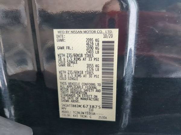 * [L92] Floor Mats W/1-Piece Cargo Area Protector * [B92] Black Splash Guards (Set Of 4) * [B93] Chrome Rear Bumper Protector * Lane Keeping Assist * Keyless Start * Rear Spoiler * [C03] 50 State Emissions * Charcoal; Seat Trim * Super BlackThis vehicle includes a Money-Back Guarantee* and passed our precise inspection process. Best of all the price you see is the price you pay. No haggling. No back and forth. No pressure. And this price is so good it is guaranteed. *Money-Back Guarantee is valid for 5 days or 250 miles, whichever comes first. Subject to certain terms and conditions. See store for details. Some restrictions apply.AutoNation CDJR Southwest is excited to offer this 2021 Nissan Rogue SV. Off-road or on the street, this Nissan Rogue SV handles with ease. The greater your fuel-efficiency, the less your carbon footprint. And with exceptional MPGs, this Nissan Rogue treads ever so lightly on Mother Earth. Few vehicles can match the safety and comfort of this AWD Nissan Rogue SV. With enhanced performance, refined interior and exceptional fuel efficiency, this AWD Nissan is in a class of its own. Gently driven doesn't even begin to explain how lovingly cared for this ultra-low mileage vehicle has been. Service records are included with the purchase of this well-maintained pre-owned vehicle. Adjectives like impeccable, spotless, and immaculate can be used to describe how clean this Nissan Rogue SV is, causing it to feel more like a new vehicle than a pre-owned one. This car enjoys a laser-perfect paint finish.