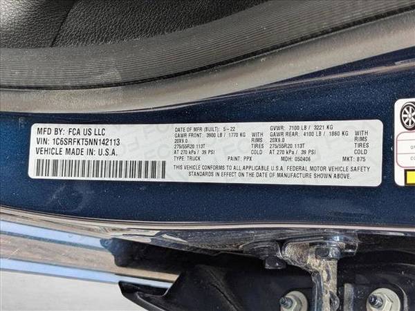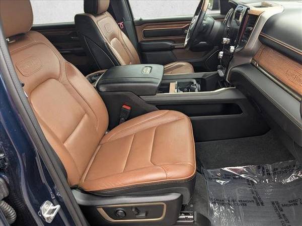* Longhorn Level 1 Equipment Group * Engine: 5.7L V8 Hemi Mds Vvt Etorque * Radio: Uconnect 5 Nav W/12.0" Display * E-Locker Rear Axle * Leather Seats * Navigation System * 33 Gallon Fuel Tank * Body Color Bumper Group * Trailer Brake Control * Patriot Blue Pearlcoat * 3.92 Rear Axle Ratio * Lane Keeping Assist * Keyless Start * Heads-Up Display * Cooled Front Seat(S) * Black/New Saddle; Leather Trimmed Bucket Seats * Front License Plate Bracket * Gvwr: 7;100 Lbs * Monotone Paint * Tires: 275/55R20 Owl All Season * Transmission: 8-Speed Automatic (8Hp75) * Wheels: 20" X 9" Aluminum Painted/PolishedThis vehicle includes a Money-Back Guarantee* and passed our precise inspection process. Best of all the price you see is the price you pay. No haggling. No back and forth. No pressure. And this price is so good it is guaranteed. *Money-Back Guarantee is valid for 5 days or 250 miles, whichever comes first. Subject to certain terms and conditions. See store for details. Some restrictions apply.2022 RAM 1500 LIMITED LONGHORN 4X4 5.6' Bed Length Accident Avoidance Systems Active Noise Cancellation Active Parking System Adaptive Cruise Control Adaptive Headlights Adjustable Lumbar Support Adjustable Pedals Alloy Shift Knob Alloy Wheels Android Auto Anti-Theft System Apple Carplay Approach Lights Audio Voice Recognition Auto Start/Stop Auto-dimming Rearview Mirror Automatic Climate Control Blind Spot Warning Bluetooth Braking Assist Bucket Seats Camera-based Rearview Mirror Chrome Exhaust Tip Chrome Grille Chrome Headlight Bezel Connected Car Connected Car Integrated Apps Cooled Seats Cruise Control Curtain Airbags Customizable Instrument Display Driver Assistance Package Dual Exhaust Dual-Zone Climate Control Electronic 4WD Selector Electronic Braking System Electronic Messaging Assistance Electronic Traction Control Emergency Braking Preparation Exterior Chrome Accents Fog Lights Front Bucket Seats Full Size Spare Tire Heated Seats Heated Side Mirrors Heated Steering Wheel Leather Seats Leather Steering Wheel Leather Trimmed Seats Lift Assist Tailgate Locking Differential Memorized Seat Settings Multi-Function Display Navigation System On Demand 4WD Parking Sensors Pickup Bed Liner Power Adjustable Pedals Power Liftgate Power Locking Tailgate Power Running Boards Power Seats Power Sliding Rear Window Push-Button Start Radio Data System Real Time Traffic Rear Cooled Seats Rear Cross Traffic Alert Rear Headrests Rear Privacy Glass Rearview Camera Regenerative Braking System Remote Engine Start Removable Tailgate Running Boards Satellite Radio Side Airbags Stability Control Steering Wheel Mounted Controls Surround View Camera Tire Pressure Monitoring System Tow Hooks Trailer Brake Controller Trailer Hitch Trailer Wiring Turn Signal Mirrors USB Audio Input Voice Activated Commands Wi-Fi Compatible Wireless Charging Station Wood Steering Wheel