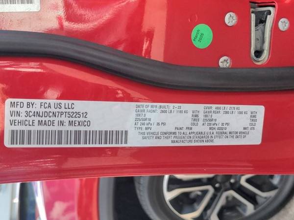The following items have been reconditioned on this vehicle: new battery! * Redline Pearlcoat * Lane Keeping Assist * Keyless Start * Rear Spoiler * Black Clearcoat * Black; Leather Trimmed Bucket Seats * Engine: 2.0L I4 Dohc Di Turbo W/Ess * Front License Plate Bracket * Tires: 225/55R18 Bsw As * Transmission: 8-Speed Automatic 8F30 * Tu-Tone Paint Group * Wheels: 18" X 7" Painted Diamond Cut AluminumThis vehicle includes a Money-Back Guarantee* and passed our precise inspection process. Best of all the price you see is the price you pay. No haggling. No back and forth. No pressure. And this price is so good it is guaranteed. *Money-Back Guarantee is valid for 5 days or 250 miles, whichever comes first. Subject to certain terms and conditions. See store for details. Some restrictions apply.Looking for a clean, well-cared for 2023 Jeep Compass? This is it. This Jeep includes: ENGINE: 2.0L I4 DOHC DI TURBO W/ESS (STD) 4 Cylinder Engine Gasoline Fuel Turbocharged *Note - For third party subscriptions or services, please contact the dealer for more information.* The Compass Limited doesn't disappoint, and comes with all the quality and understated opulence buyers have come to expect from the respected Jeep marque. A truly versatile SUV, this vehicle will please even the most discerning of buyers. Save money at the pump with this fuel-sipping Jeep Compass. Taking the road less traveled has never been more fun than with this 4WD. With improved performance, mileage and acceleration, this 2023 4WD Jeep Compass Limited is king of the off-road.