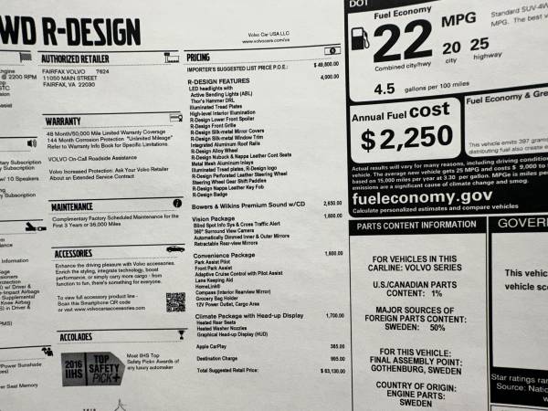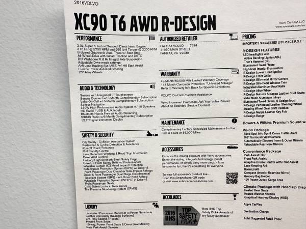 Up for sale is a stunning 2016 Volvo XC90 T6 'R' design 4x4 SUV. Passion Red with excellent Black suede leather interior. Window sticker of $63k new (Over $12k in factory options). 1 Owner. T6 (supercharged & turbo) engine, 8 Speed Automatic. R design package ($4,000), Vision Package ($1,800), Bowers And Wilkins Premium Sound, Convenience Package ($1,800), Head-Up Display, Alloys, Paddle Shift, Panoramic Moonroof, Heated front Sport seats, Tons of safety features including, City Safe, Pedestrian Collision warning, Run off road protection, Lane departure warning, BLIS, adaptive cruise, too much to list.