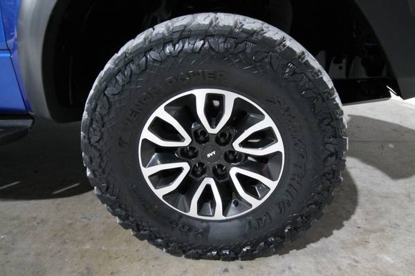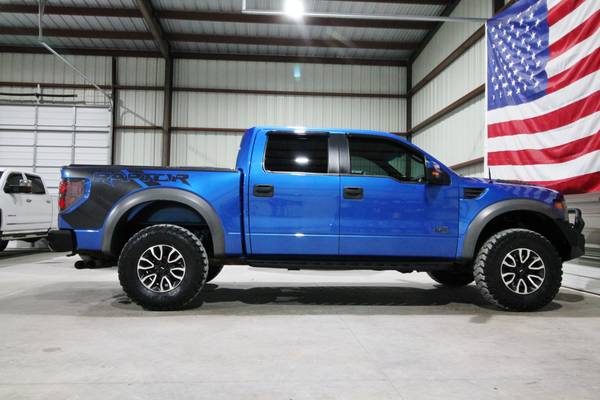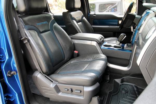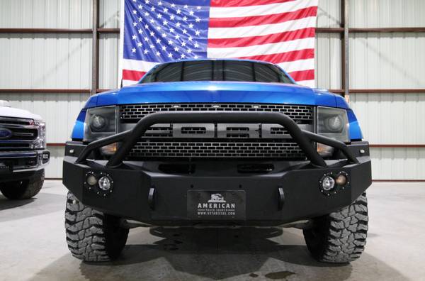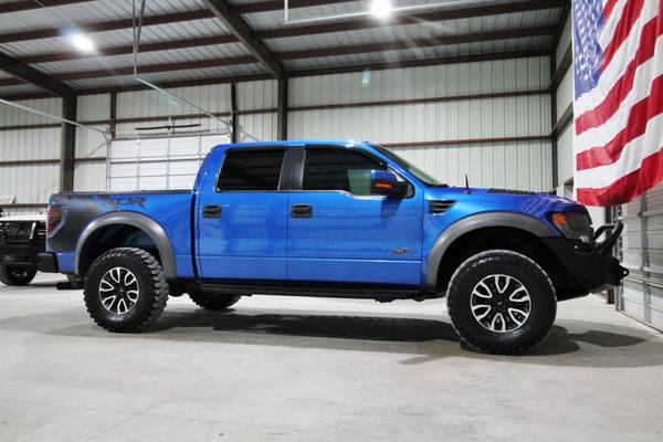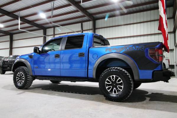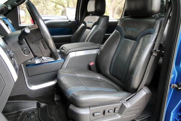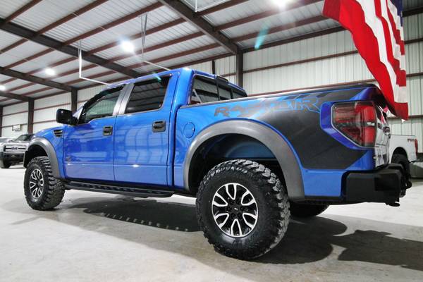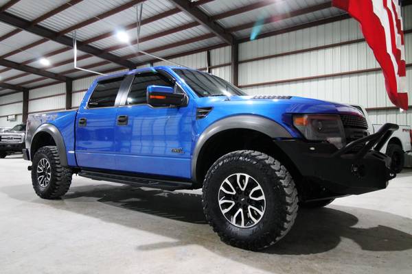 This 2013 Ford F-150 SVT Raptor is a sharp and hard-to-find truck powered by the 6.2L V8 paired with an automatic transmission and electronic four-wheel drive. With 171k miles, two owners, and 30 detailed service records reported to Carfax, it has been well maintained. It sits on brand-new 35" mud-terrain tires and features Fab Fours replacement bumpers front and rear, FOX Racing suspension, factory HD rock slider steps, and factory projector headlights. The body is clean and straight, highlighted by an ultra-rare blue-on-blue color combo. Inside, it offers black leather with blue inserts, dual power seats, heated and cooled seats, power adjustable pedals, a factory touchscreen radio, backup camera, sunroof, SVT upfitter switches, and a built-in trailer brake. Additional conveniences include power mirrors, power windows, and power locks, making this Raptor both a head-turner and a capable performer on or off the road.