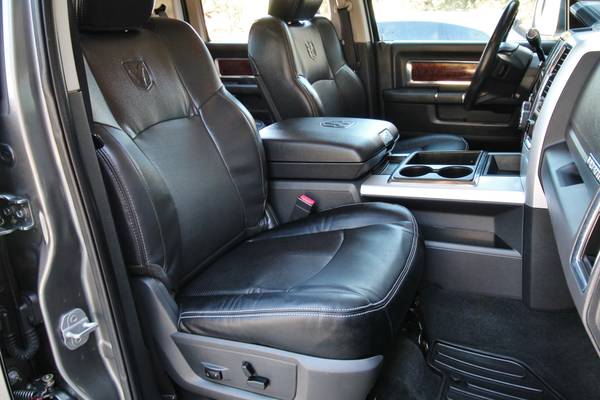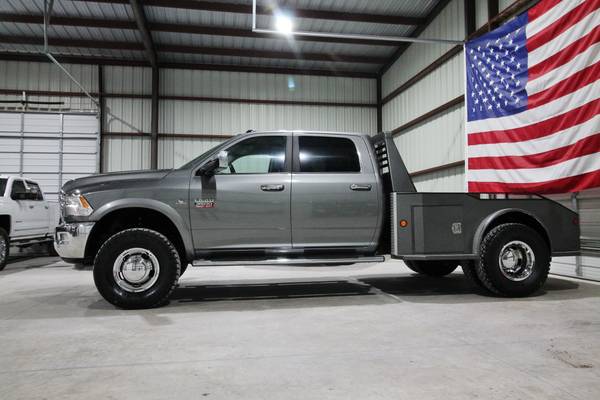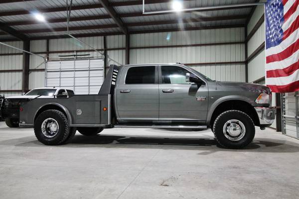This 2012 Ram 3500 Laramie 4x4 is a clean, one-owner truck powered by the 6.7L Cummins Turbo Diesel paired with an automatic transmission and four-wheel drive, showing only 100k miles with a clean Carfax. It’s leveled and riding on brand-new 35” mud-terrain tires, plus it features a super nice painted-to-match skirted flatbed with trough and dovetail—this truck is a total head turner! Inside, it has a clean black leather Laramie interior with no smoke or foul odors, a fixed center console, dual power seats, factory touchscreen radio with navigation, backup camera, dual-zone climate control, electronic 4x4, built-in trailer brake, and full power options including power windows, locks, and mirrors. A low-mile, high-quality Cummins that’s ready to work and look good doing it!