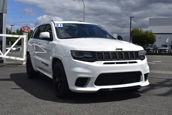 2021 JEEP GRAND CHEROKEE TRACKHAWK 6.2L Supercharged HEMI® V8 SRT Engine Suede / Nappa Performance Seats Bright White Clear–Coat Exterior Paint Brembo® 6–Piston Fixed Front Brakes 200–MPH Primary Speedometer Competition Suspension Dual–Pane Panoramic Sunroof Heated Front Seats Ventilated Front Seats Heated Second–Row Seats REMOTE START TWO RED KEYS LOADED