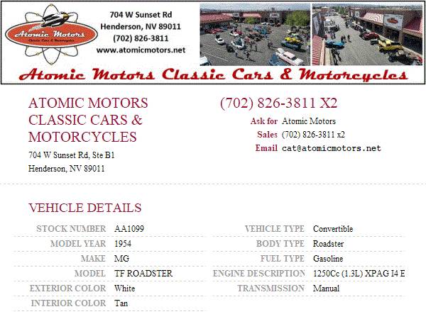 This vehicle is located at Atomic Motors Classic Cars & Motorcycles in Henderson, NV just 20 mins from the fabulous Las Vegas Strip. Come down and see us or call 702-826-3811 x2. Additional pictures and videos may be found on our site at www.atomicmotors.net