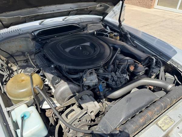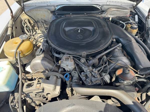 The replacement 4.5-liter M117 V8 and three-speed automatic transmission were installed under prior ownership. The cylinder heads were replaced in 2009 and the fuel injectors were replaced in April 2022.