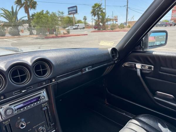 Finished in Astral Silver over black leather upholstery, equipment includes polished 14″ Bundt alloy wheels, fog lights, power windows, air conditioning, chrome bumpers, polished aluminum trim, and an aftermarket CD stereo. This 450SLC is now offered with manufacturers literature, repair manuals, a copy of the data card, service records, and car cover.