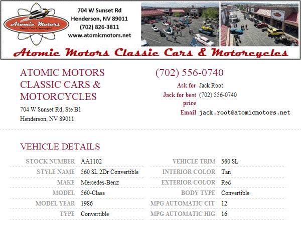 This vehicle is located at Atomic Motors Classic Car Sales and Restorations in Henderson, NV just 20 mins from the fabulous Las Vegas Strip. Come down and see us or call Jack for best price at 702-556-0740 or call our sales dept at 702-826-3811 ext 2 for general information. Additional pictures and videos may be found on our site at www.atomicmotors.net
