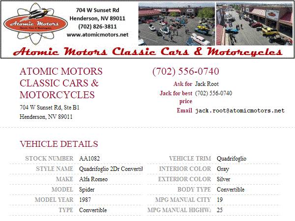 This vehicle is located at Atomic Motors Classic Car Sales and Restorations in Henderson, NV just 20 mins from the fabulous Las Vegas Strip. Come down and see us or call Jack for best price at 702-556-0740 or call our sales dept at 702-826-3811 ext 2 for general information. Additional pictures and videos may be found on our site at www.atomicmotors.net
