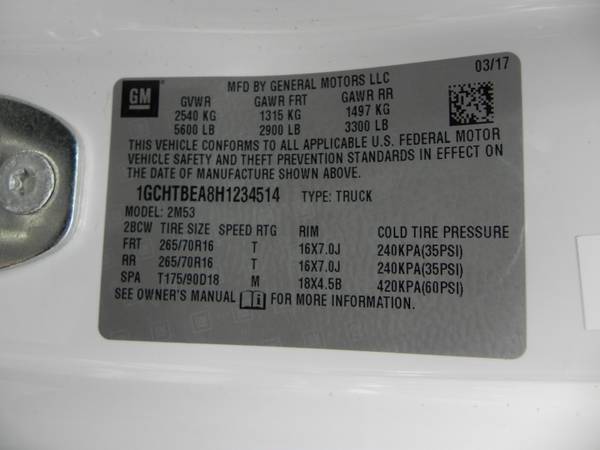 2017 Chevrolet Colorado Work Truck 4x4 Extended Cab, 6 ft. Long Bed, 69,984 Miles, White on Gray, OPTIONS: 2.5L 4 Cylinder Engine, Automatic Transmission, 4x4, All Power Options, A/C, Back Up Camera, Vinyl Interior, Slide Out Truck Bed Storage and much more!!!
