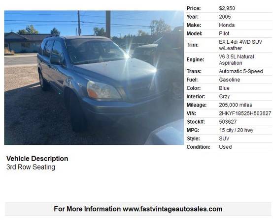 2005 Honda Pilot EX L 4dr 4WD SUV w/Leather 3rd Row Seating 205000 Miles Auto www.fastvintageautosales.com