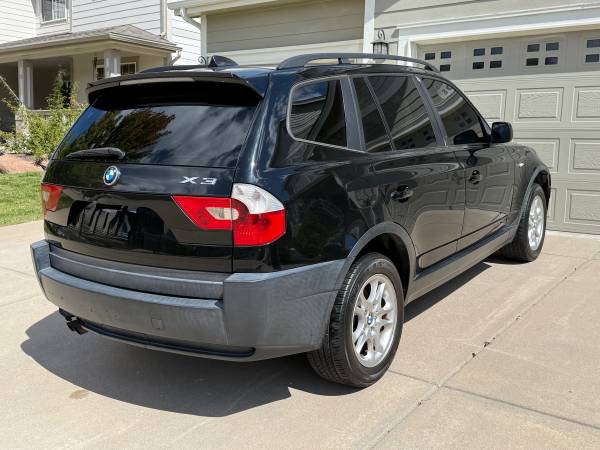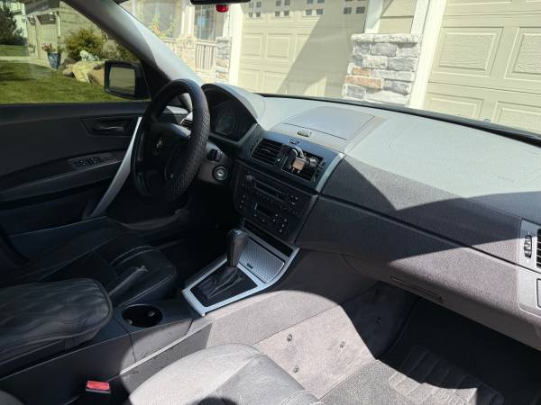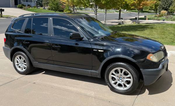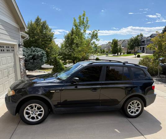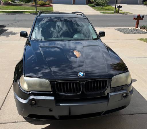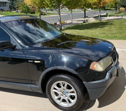 2004 BMW X3 AWD 2.5 liter, straight-6 cylinder engine. This vehicle runs well, hood needs work, body in good condition overall. *Passenger front and rear window operation will need to be repaired (front and rear passenger side windows currently do not role down). New tires, no service lights, has 174,000 miles. Gets 15/23 MPG…Great vehicle for this Rocky Mountain region. Handles great in the snow. Excellent vehicle for the daily run-about.
