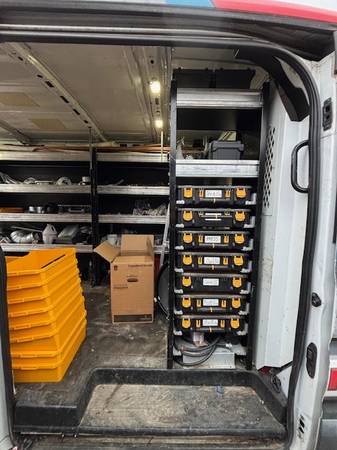 2016 Ford Transit van – clean title, well-maintained, and ready to hit the road. This van is set up perfectly for a contractor, electrician, plumber, or any tradesperson. It has built-in shelving for tools and equipment in the cargo area, making it a mobile workspace that’s ready to go.