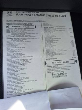 2017 Ram 1500 Laramie with all the options. Leather interior, 6'4" bed, 3:92 gear ratio, factory air suspension, factory spray in bed liner, good tires. Just had the entire engine compartment wiring harness replaced, new battery, new alternator. Everything works perfectly. Great truck with a lot of life left in it.
