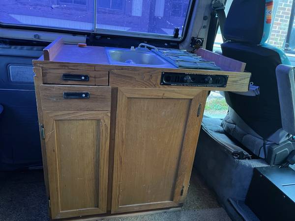 Rock and Roll bench bed. Removable camper cabinet with sink and stove, storage and water (6 gallons).