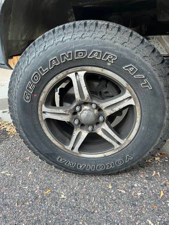 New tires less than 10000 miles. Yokohama Geolanders, much more quiet on the road. larger than stock 15's, including spare. Modified spare clamshell to fit the full size matching spare.
