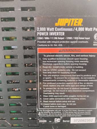 Great working inverter. I use it on a hot plate,cutoff grinder or my George Foreman grill works great. 2000 Watt continuous 4000 Peak