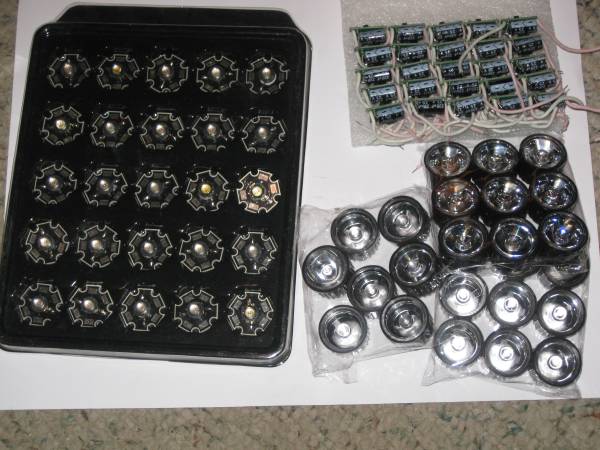 This listing is for one lot of 25, 3 Watt High Intensity 5500K White Chip Mounted LED's, 25 12V-24V Drivers, 25 30 degree lenses 3/4" dia.