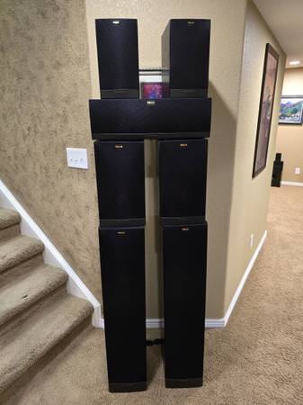 7 Channel home theater system comprised of Klipsch reference speakers: RF- 62ii TOWERS, RB - 61ii SIDE SURROUND, RB-51ii REAR SURROUND, and RC-52ii CENTER. All speakers are in like new condition. No scratches on cabinets or tears on grills. Good for Stereo, music and home theater.
