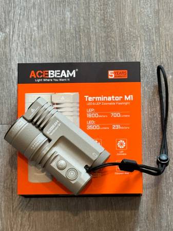 For sale is a like new Acebeam Terminator M1 with the upgraded 5000K, CRI90 LED. Comes complete as pictured with the flashlight itself, rechargeable 21700 battery, and original box and carrying pouch.